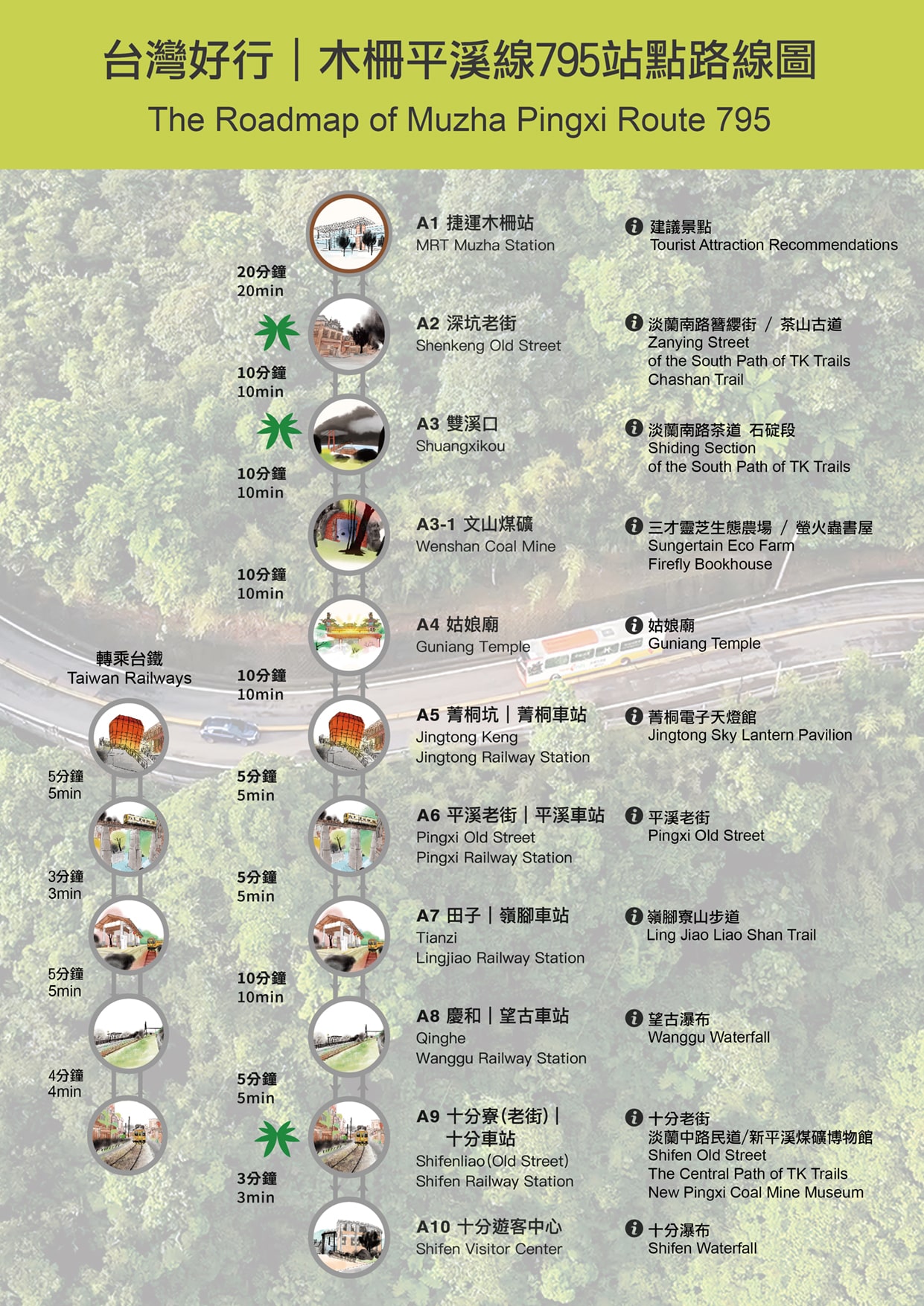 搭乘台灣好行795的旅人,可於站點 A5菁桐坑﹑ A6平溪老街﹑ A7田子﹑ A8慶和或 A9十分寮下車,轉乘火車,欣賞菁桐﹑平溪﹑嶺腳 ﹑望古與十分沿線鐵路風景。 台鐵平溪支線時刻表
