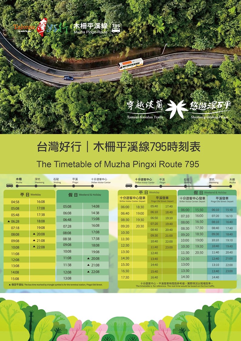 搭乘台灣好行795健康巴士──體驗【一包在手,說走就走】的綠色旅遊,體驗深坑﹑石碇﹑平溪在地山林路徑﹑小鎮人文品味與百年鐵道文化;穿越淡蘭,一起相遇更好的自己。